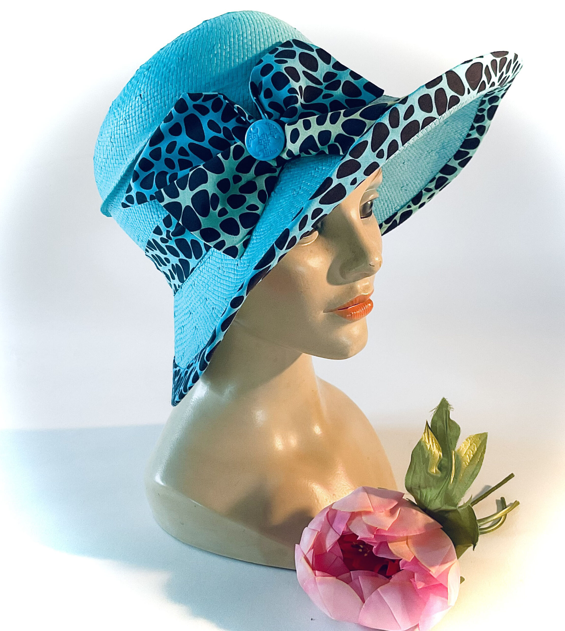 Ein kräftig türkiser Sommerhut aus Seidenpapier-Geflecht, stabilisiert und lackiert wird dieses Teil sehr robust. Die Einfassung besteht aus mehrfarbigem Baumwollmousseline , hellblau-türkis im Farbverlauf, so wie auch die verstellbare Schleife, garniert mit einem alten Glasknopf aus den 50-ern.