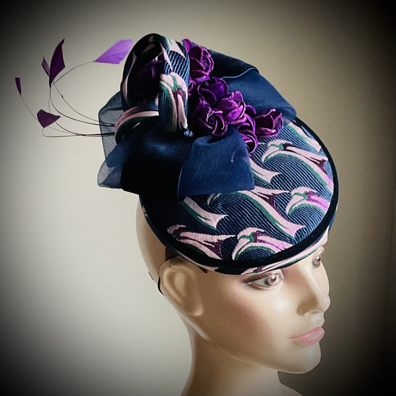 Eine aufwändig gearbeitete Pillbox- ein echtes Prachthütchen in Brokat, Samteinfassung, Organza, einer Kaskade von Samtröschen und Blinkerfedern. Die langwierige Handwerksarbeit kann man hier erahnen. Das Teilchen sitzt auf einem verstellbaren Haarreif oder mit Elastikkordel wo immer Sie wollen fest auf dem Kopf