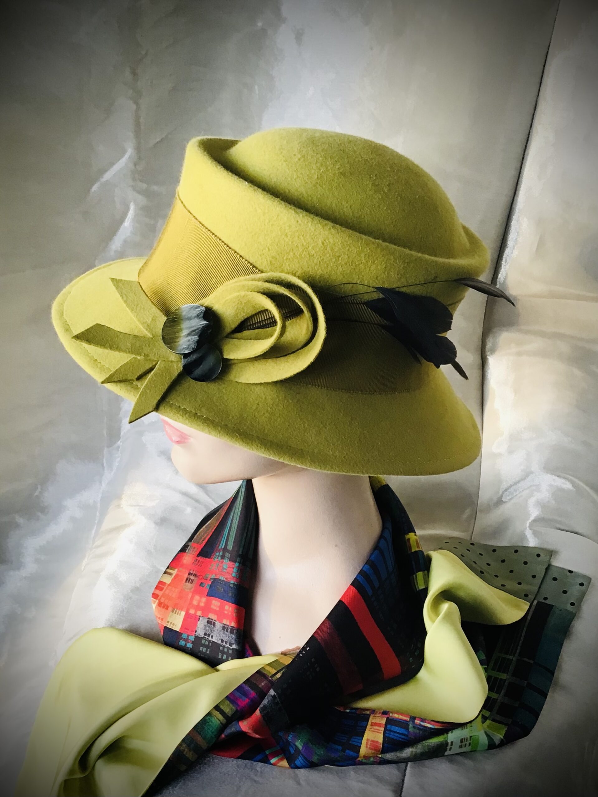 Ein besonders feiner Hut aus Haarfilz in einem gedeckten Zitruston, farblich abgestimmt mit changierenden Knöpfen und Federn. Der Filz ist so leicht, dass der Hut kaum auf dem Kopf spürbar ist. 55-56 cm Kopfumfang. Passend dazu ein doppelseitiger Seidenschal mit abgesetzten Enden,.auch ein Unikat.